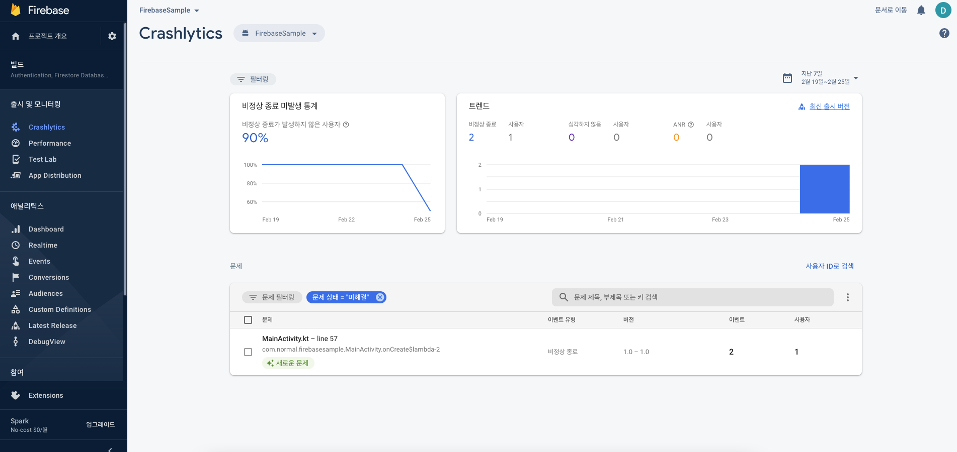 - 강제로 비정상 종료 후 Firebase Console Crashlytics 메뉴로 들어가 보면 하기 캡처 화면과 같이 비정상 종료가 보고되어있다