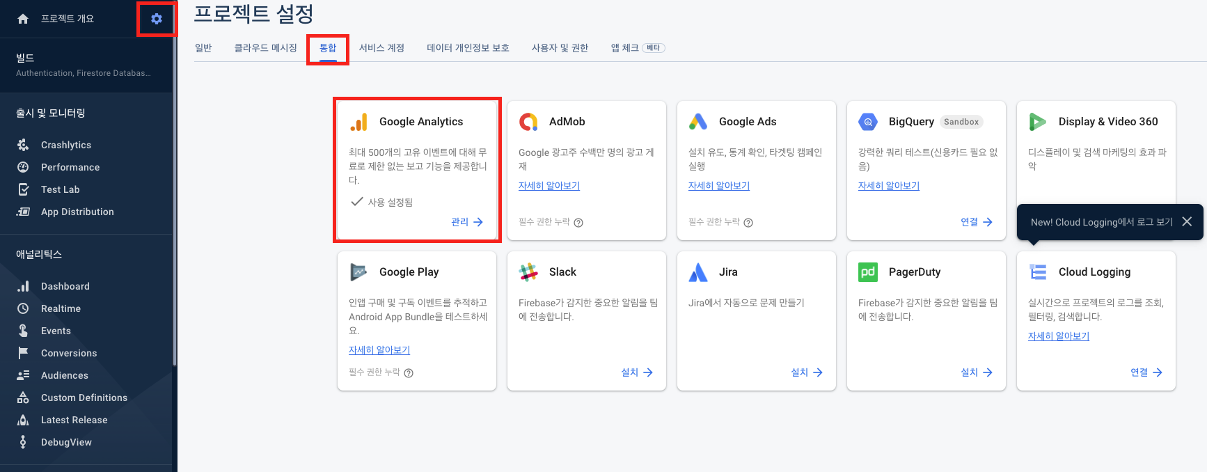 - 다만 Crashlytics 사용 환경을 최적화하려면 Firebase프로젝트에서 Goole 애널리틱스 사용 설정을 하고 해당 SDK를 추가해주는 것이 좋다고 구글이 권장하고 있다. 하기와 같이 메뉴를 따라 사용 설정하면 된다.