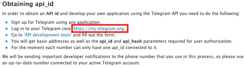 설명은 읽어보면 될 거 같고 중간에 Creating an application을 통해 Telegram App을 생성한다.