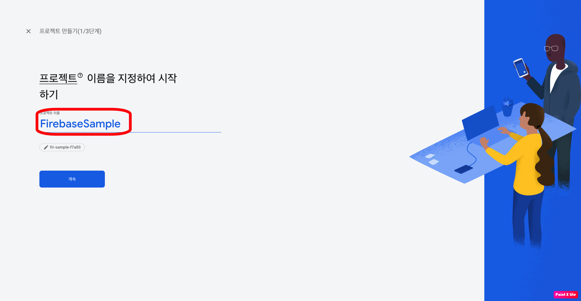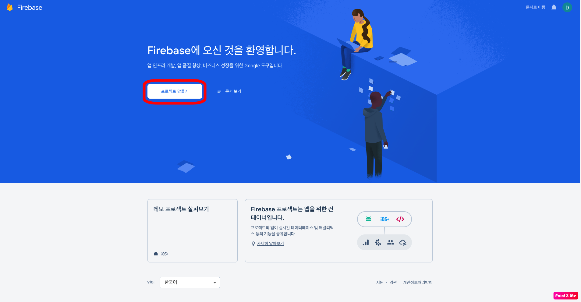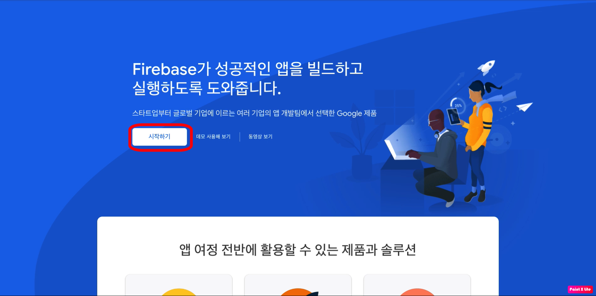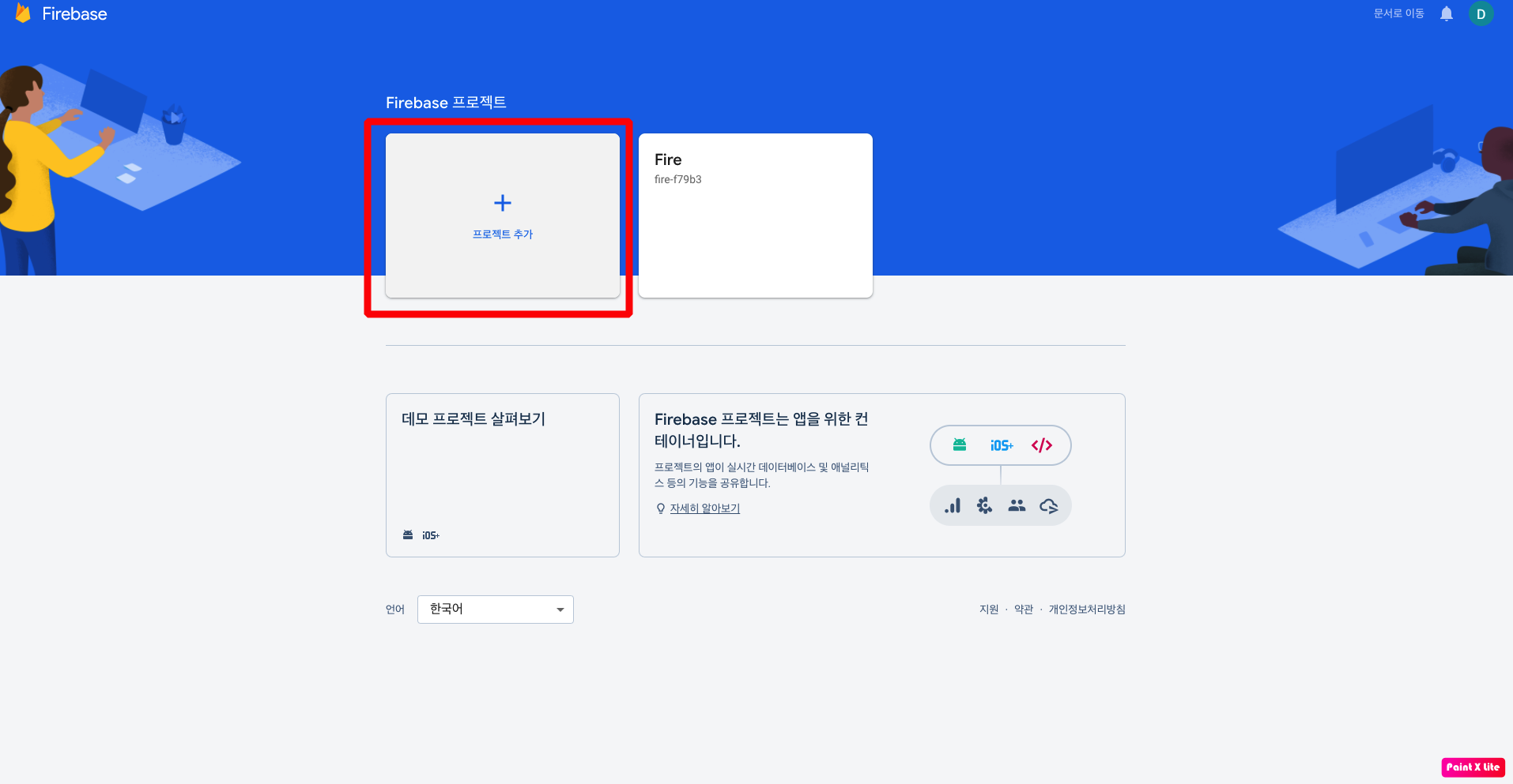 - 시작하기를 클릭하여 Firebase Console로 접속함