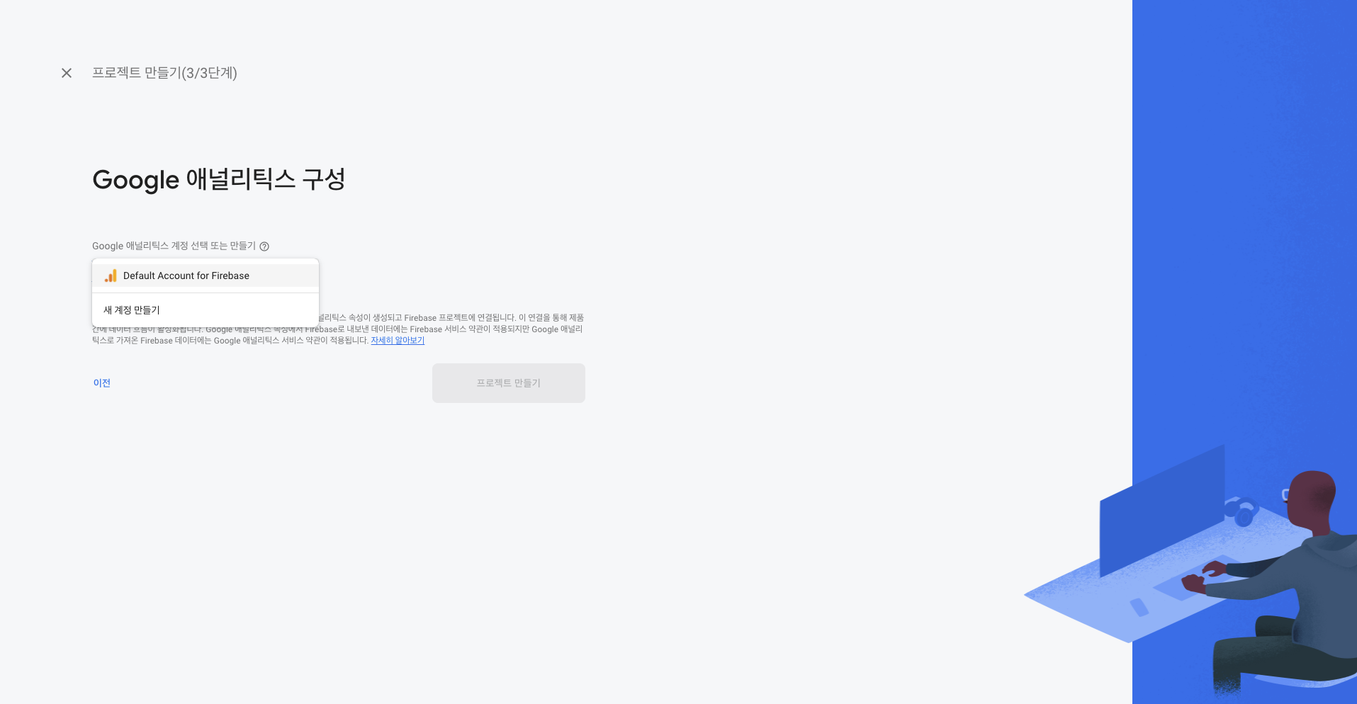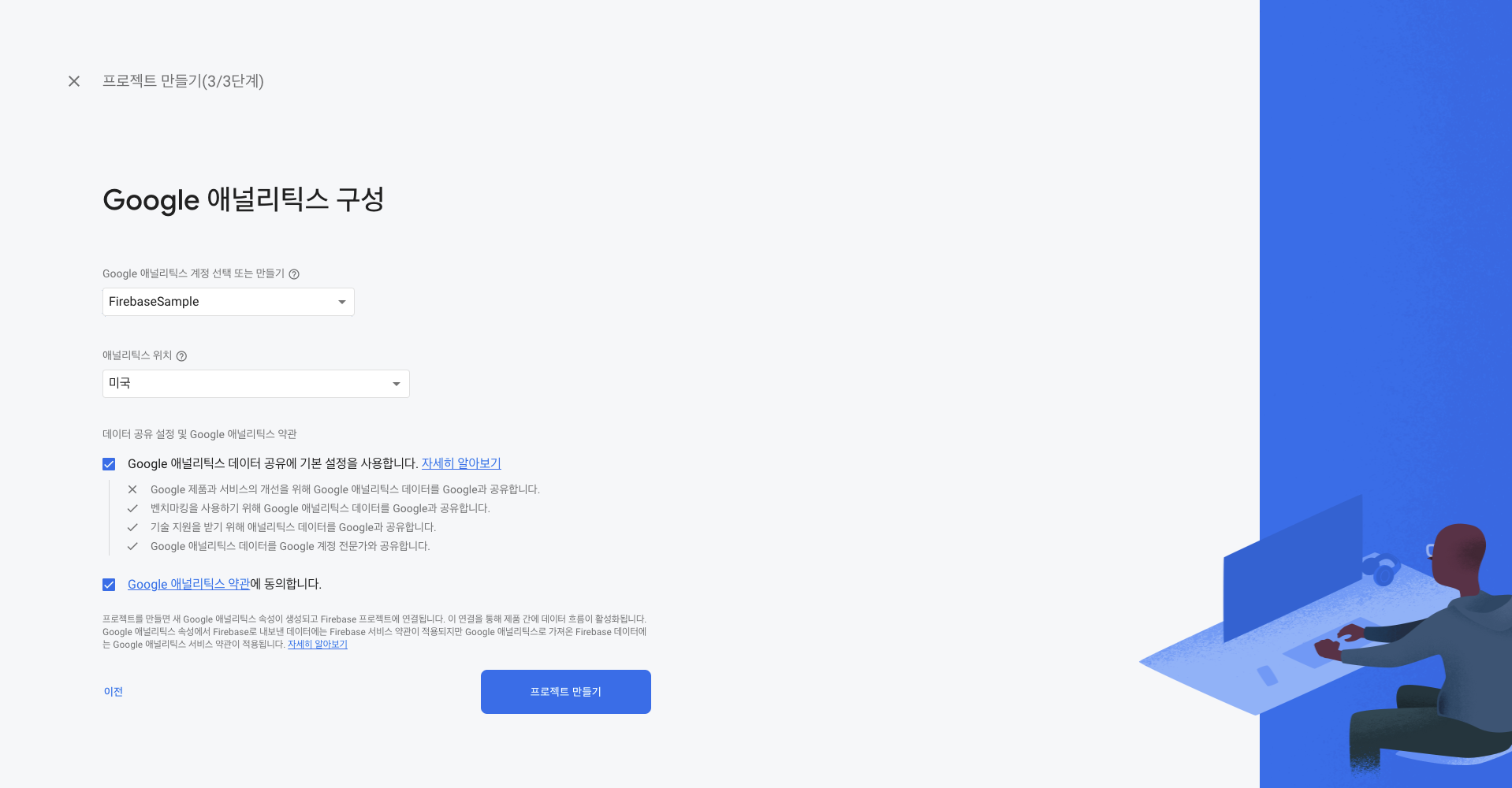 - Google애널리틱스 계정 선택 및 애널리틱스 위치를 선택하고 약관의 동의 여부를 설정하고 프로젝트 만들기를 클릭하여 생성함