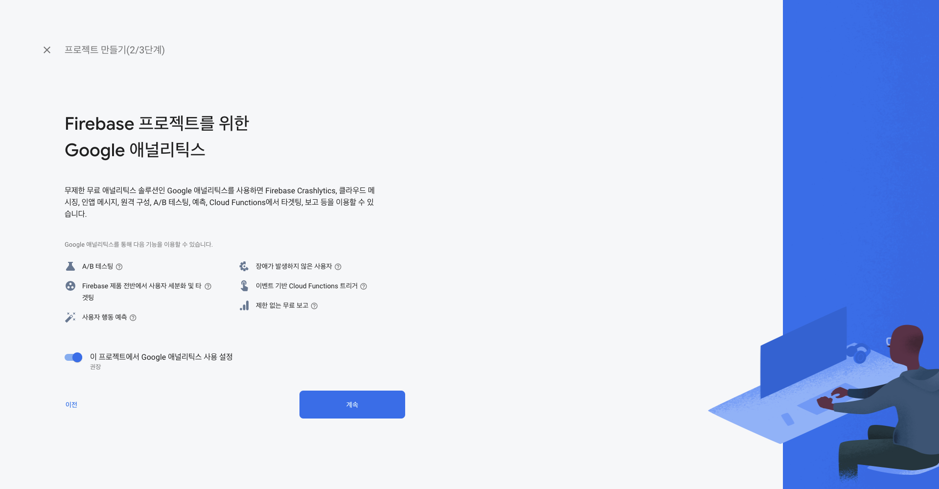 - 기존의 Firebase 프로젝트 생성이 이력이 있다면 하기와 같은 화면이 나오고 최초 생성이라면 하기 화면 없이 다음 화면으로 넘어감