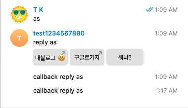 url을 셋팅한 버튼은 해당 url로 이동하게 되고 callbackData를 입력한 버튼은 callbackQuery타입으로 updateRecevied에 전달된다.