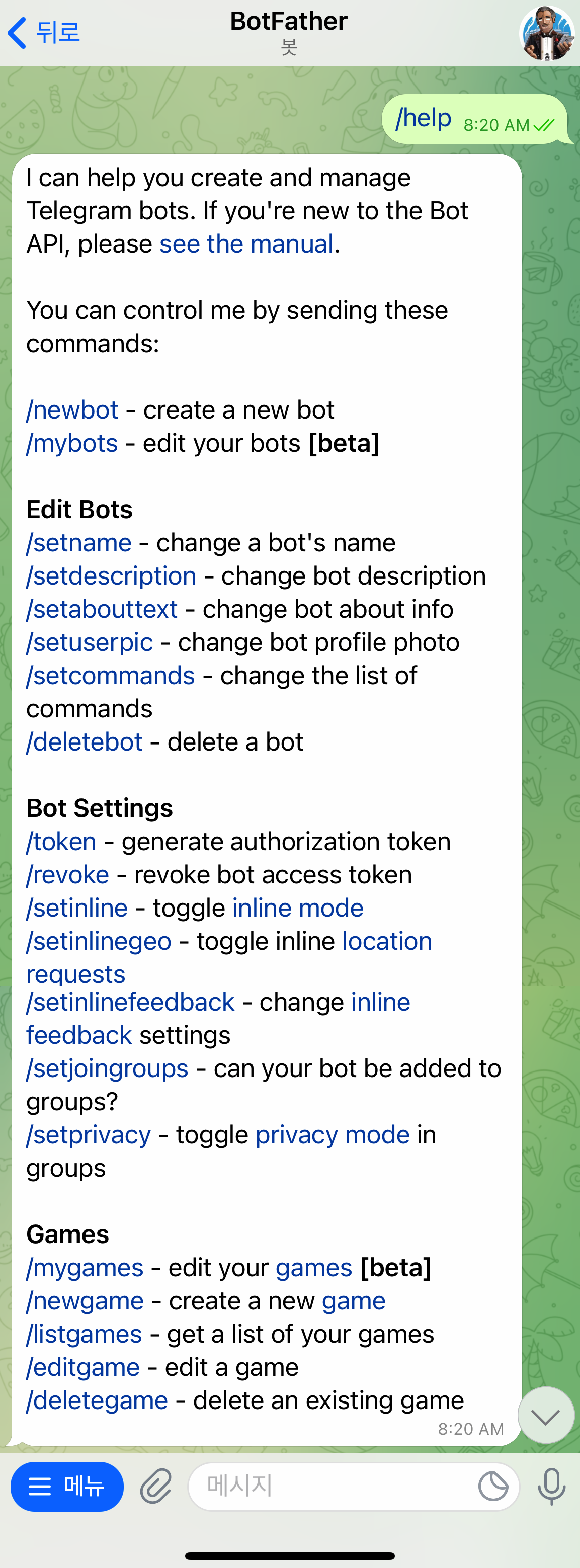 BotFather를 통해 이미 봇을 하나 만들었다고 가정을 하고 Botfather에서 /help 를 입력하게 되면 여러가지 명령어들을 소개해준다. 이 명령어들도 시간이 날때 마다 하나씩 분석해서 포스팅해 볼 예정이다.