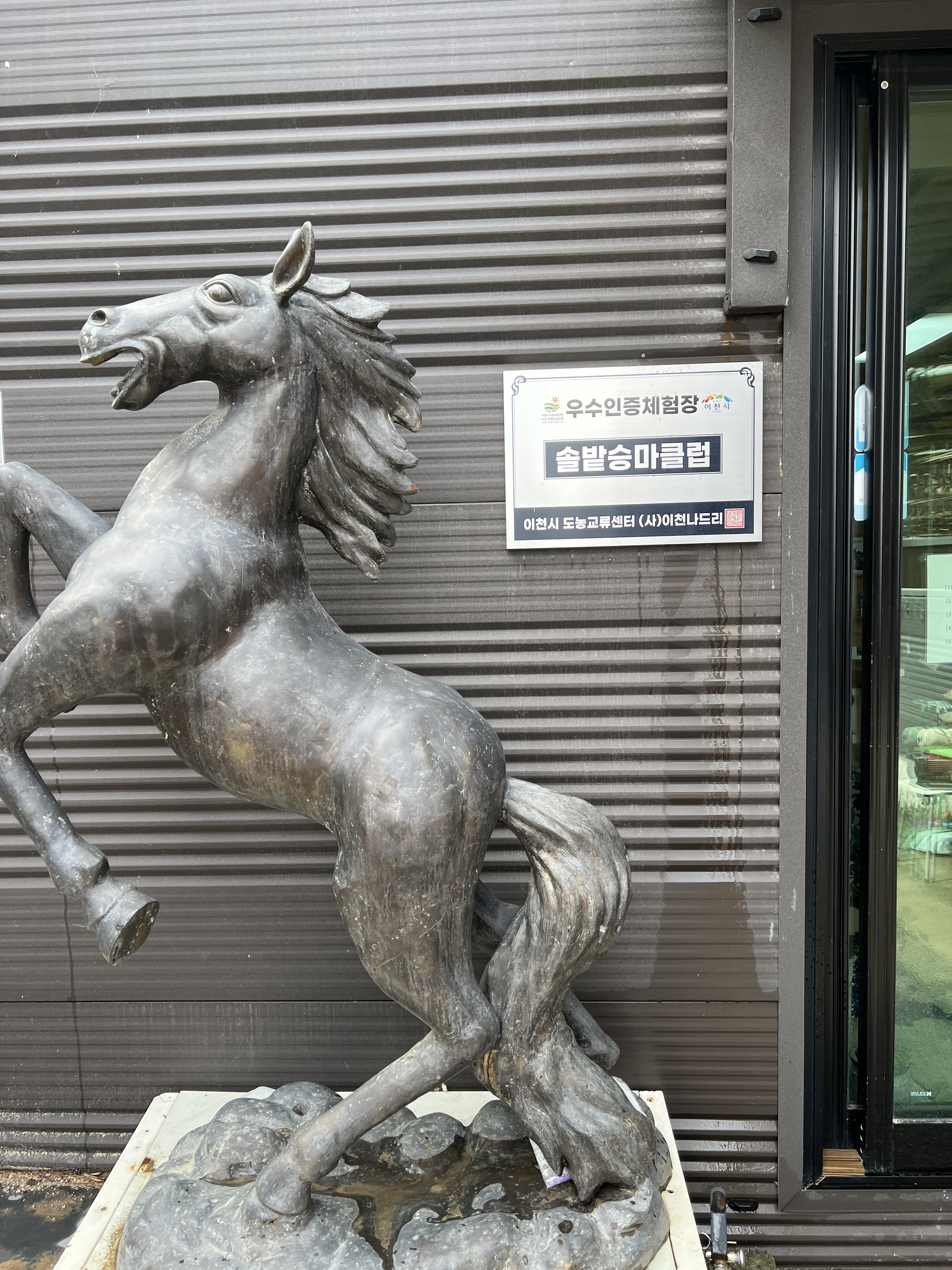 사무실 입구에는 말 동상이 있고 사무실 안쪽에는 안전수칙 및 승마장 소개가 되어 있고 남녀별도 탈의실/ 화장실 몇 개의 테이블이 있다.
