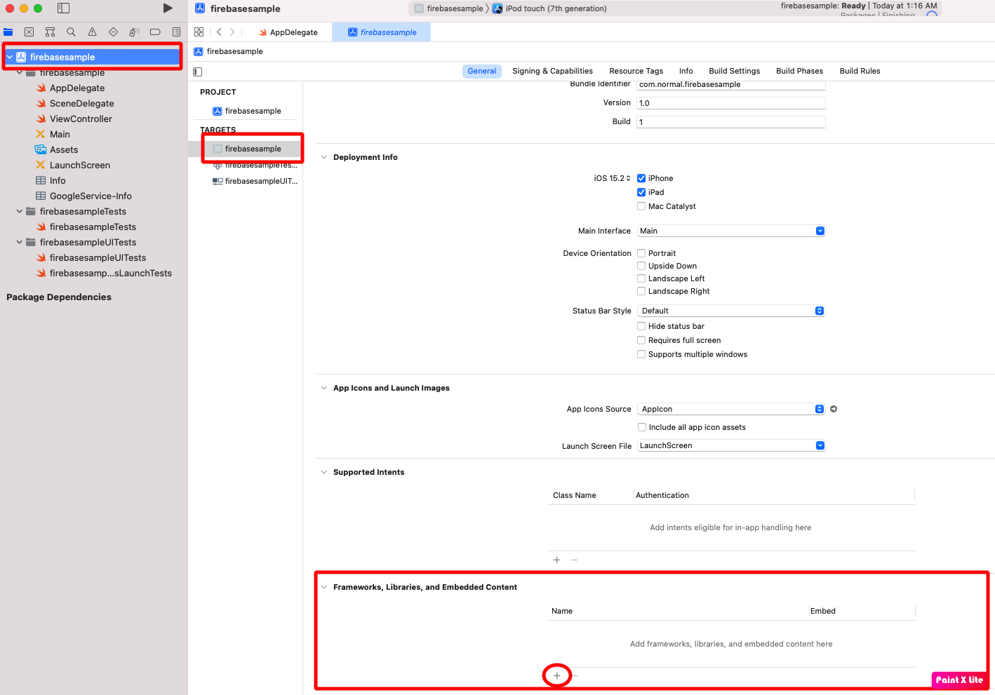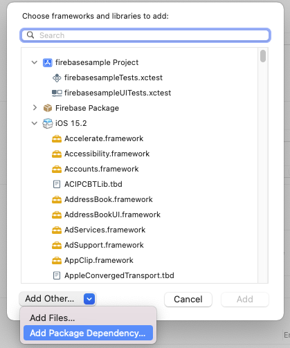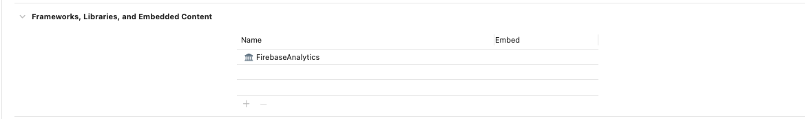 - 하기와 같이 Target설정에서 Framework, Libraries, and Embedded Content메뉴에서 Firebase SDK를 추가한다.