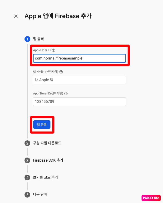 - Firebase를 추가할 앱의 Apple Bundle ID를 입력 앱 등록 버튼을 클릭한다.