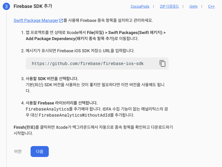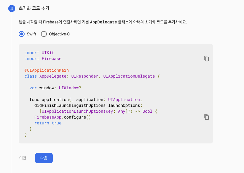 - SDK 추가 후 초기화 코드를 AppDelegate에 추가 후 다음 단계로 넘어가 콘솔로 이동 버튼을 누르면 완료