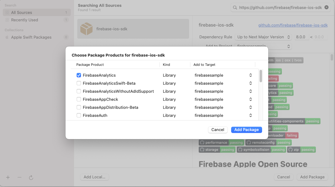- 추가하게 되면 하기 그림과 같이 사용할 라이브러리를 선택하는 화면이 나오는데 Firebase 추가 설명에는 IDFA 수집 기능이 없으면 FirebaseAnalyticsWithoutAdId를 선택하라고 하는데 추후에 변경 가능 하니 FirebaseAnalytics를 선택하고 Add Package를 통해 SDK를 설치한다.