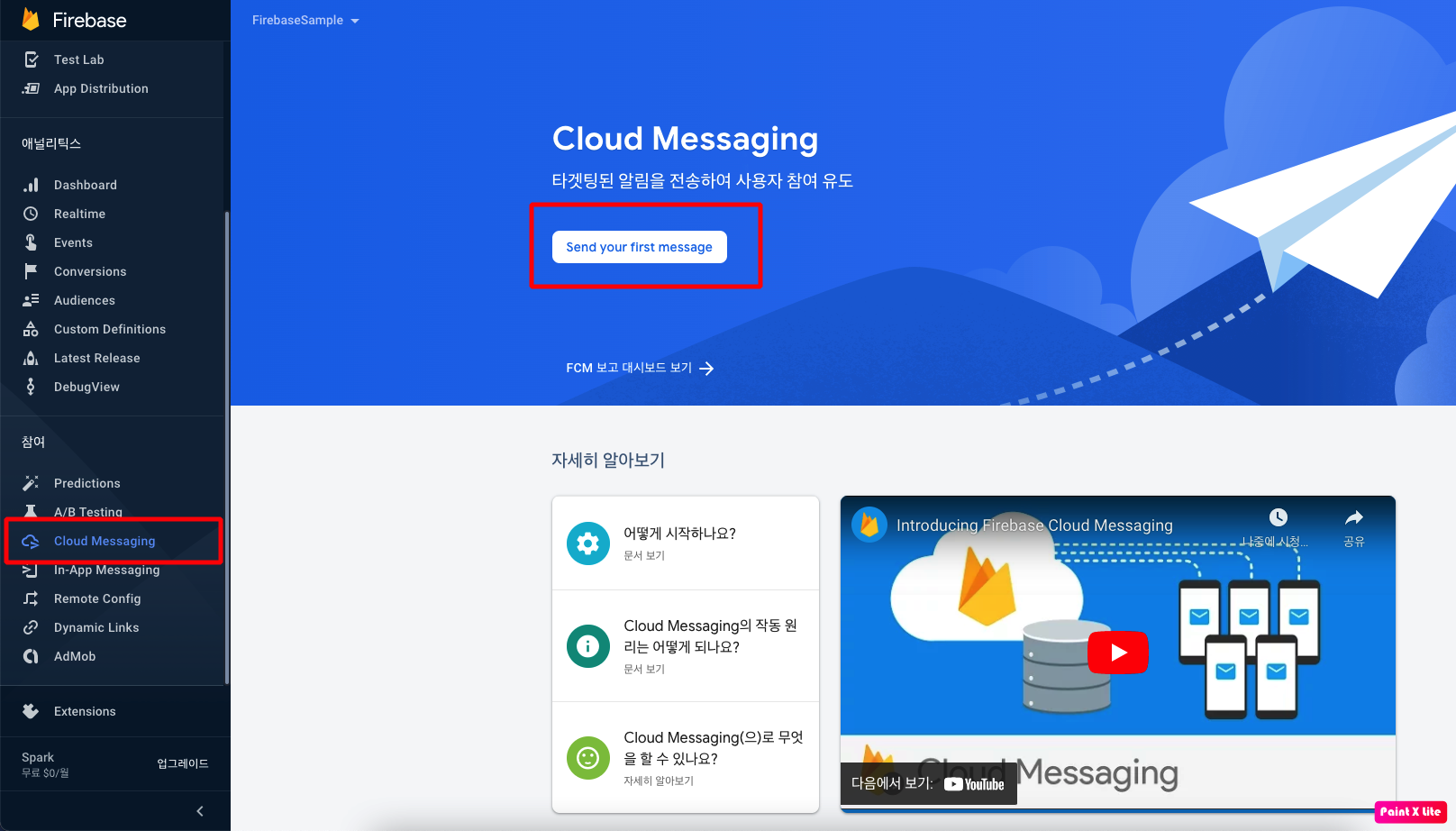- 좌측 메뉴에서 Cloud Messaging으로 들어가 화면 상단 가운데쯤에 Send your first Message 버튼을 클릭하여 다음 화면으로 진입한다.