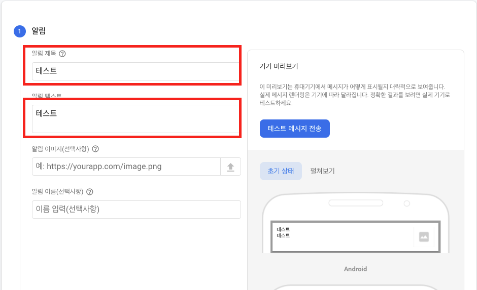 - 알림 제목과 알림 텍스트 항목을 입력 후 테스트 메시지 전송 버튼을 클릭
